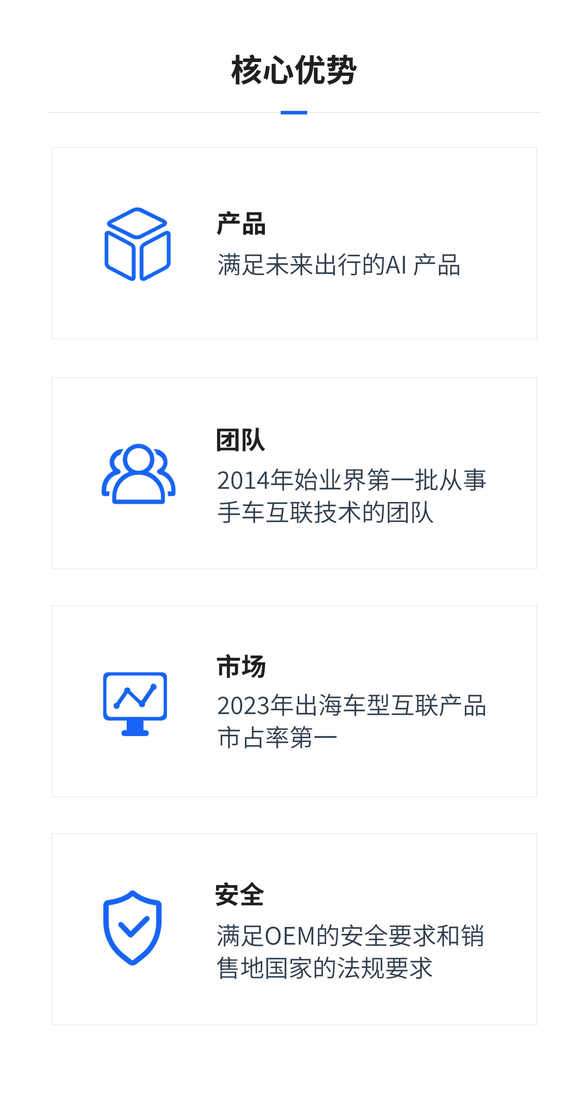 公司以通讯和多媒体为技术核心,以产品为抓手,提供智能座舱全场景解决方案。通过融合手云的云资源,创造座舱丰富应用生态。团队90%为技术研发人员,深耕车联网和座舱音频领域以技术和能力,打造场景化座舱差异化,实现产品竞争力。